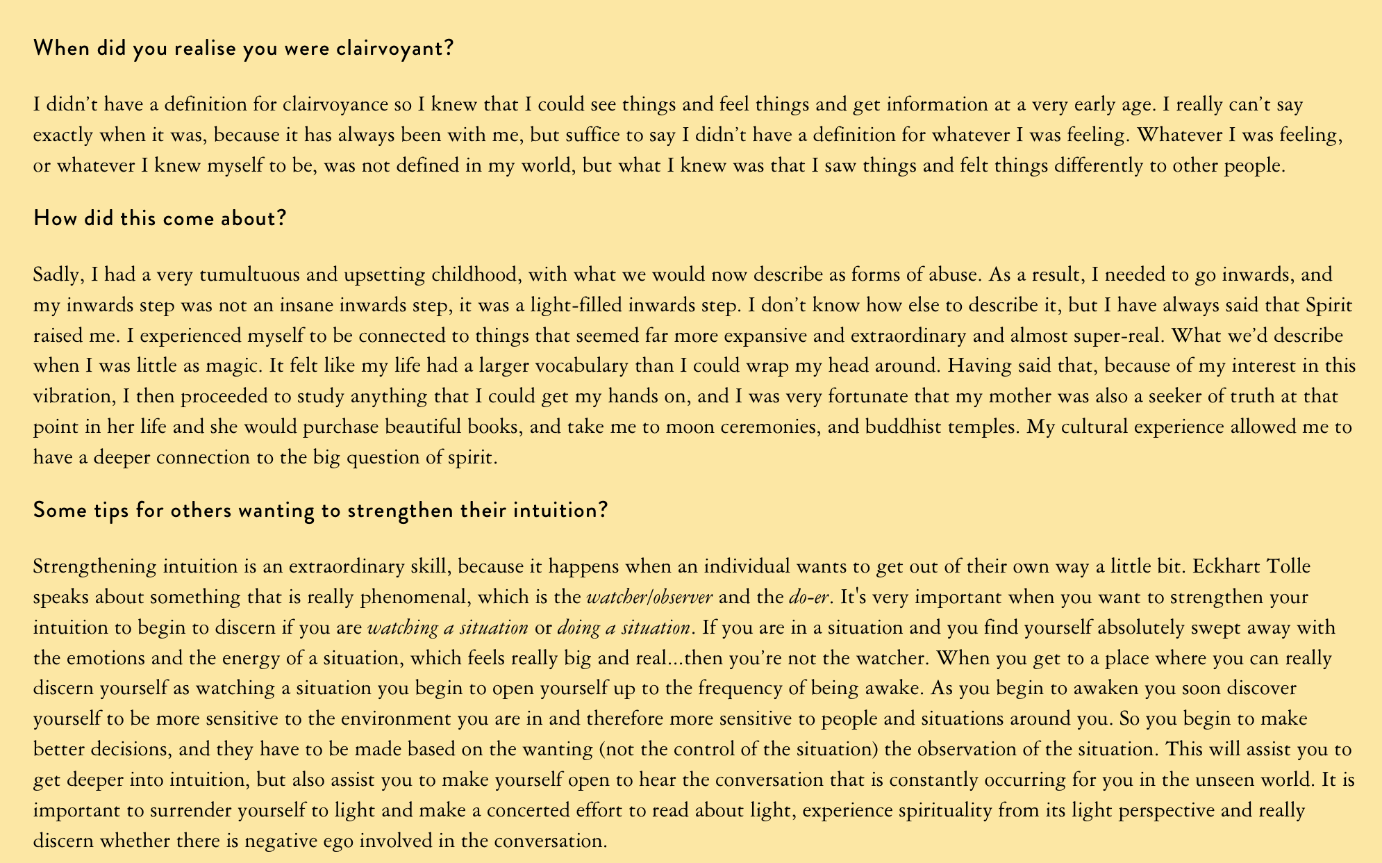 “This interview with my personal clairvoyant @sannapurinton is deep and insightful. She shares her ways to strengthen intuition, what self love really is, how to deal with dark emotions and so much more.